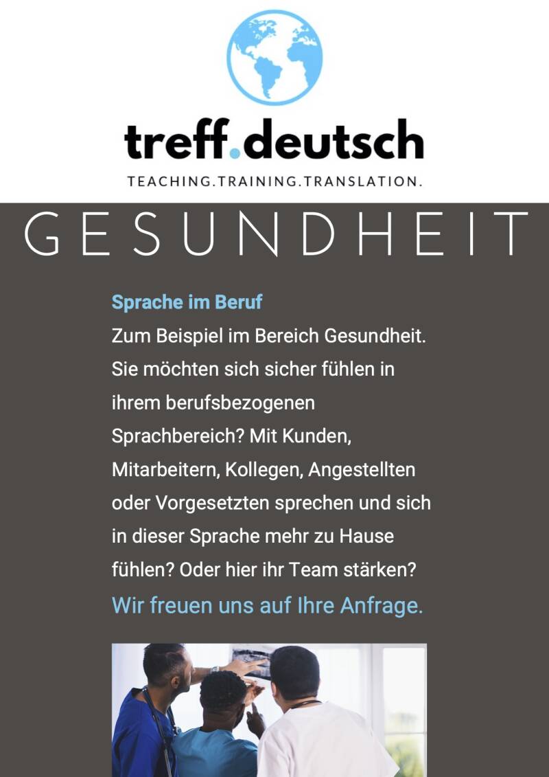 Inoltre, “treff.deutsch-al-lavoro” beneficia di una piccola rete di formatori specializzati e/o certificati in vari settori. Grazie a questo, può offrire la possibilità di approfondire il tedesco in ogni campo di specializzazione.